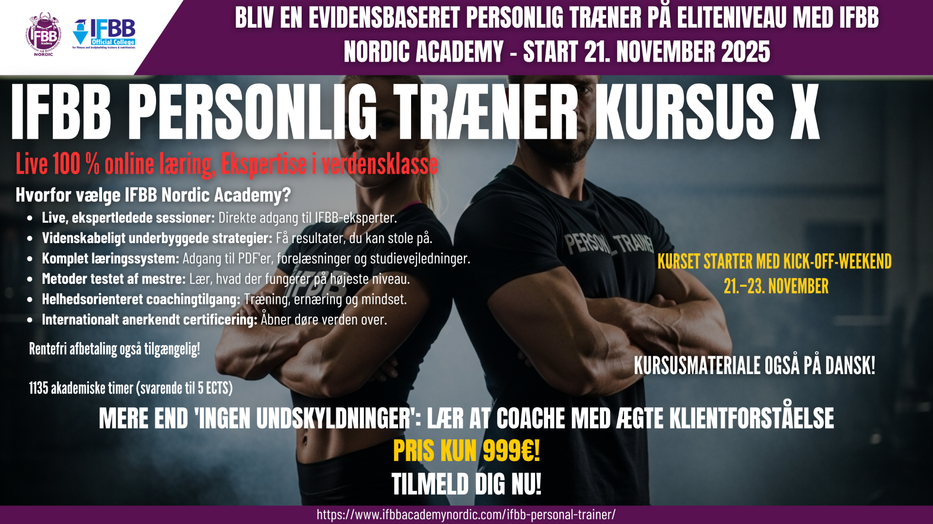 Gå ikke glip af denne mulighed for at dykke ned i fitness- og bodybuildingverdenen med IFBB Nordic Academy. Udvikl dit potentiale og bliv en del af de bedste personlig trænere i verden.
