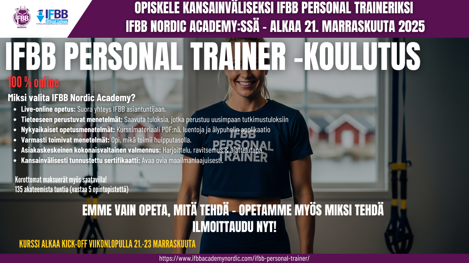 Suorita kansainvälinen IFBB Personal Trainer koulutus ja osallistu marraskuussa 2025 alkavalle kurssille!