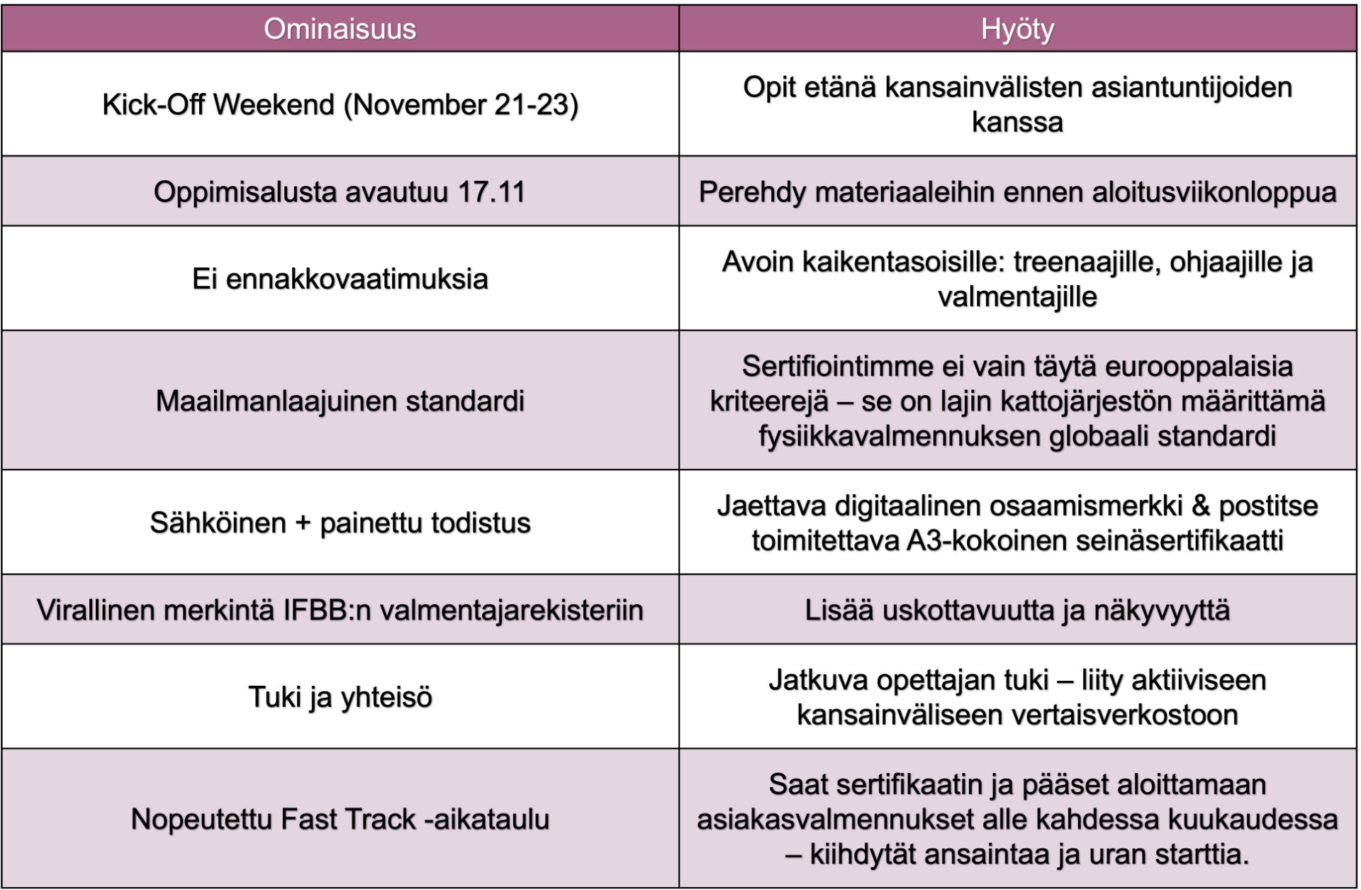- Lisäarvoa jäsenyydestä: Kurssin päätteeksi saat myös yhden vuoden jäsenyyden IFBB Collegeen, joka tarjoaa pääsyn asiantuntijaverkostoomme ja jatkuvan oppimisen mahdollisuuksia.